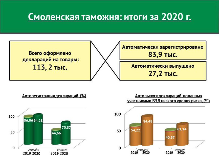 За 2020 Калужской таможней оформлено 25 102 деклараций на товары (далее – ДТ). Из них на экспортируемые товары подано 2759 ДТ, на импортируемые – 22 343 ДТ.