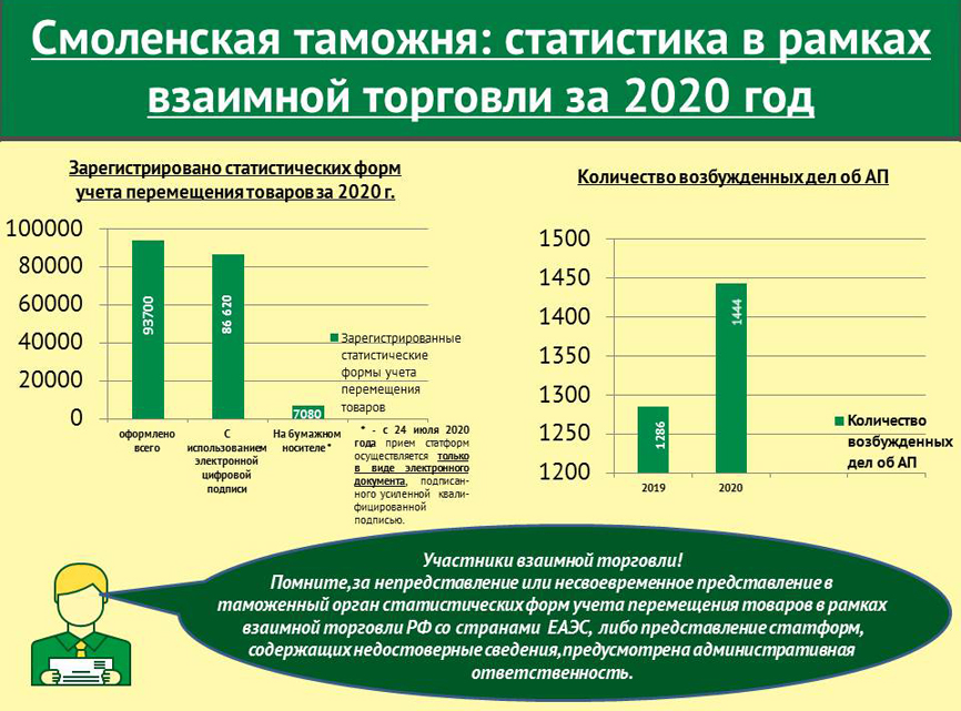 В 2020 году таможенные органы Российской Федерации возбудили более 2 тыс. уголовных дел и свыше 114,5 тыс. дел об административных правонарушениях.