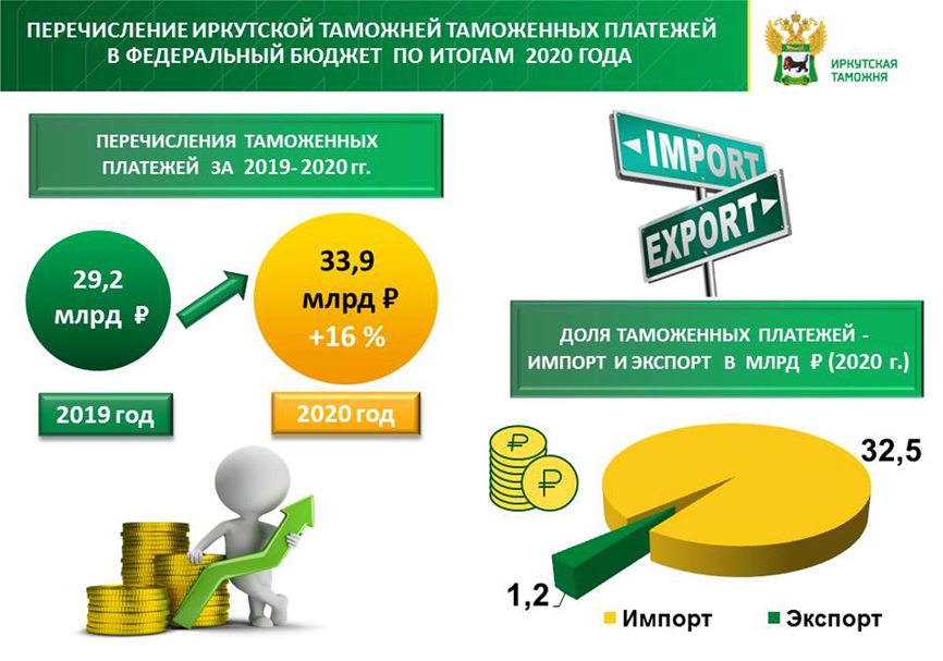 В 2020 году Центральным таможенным управлением перечислено в федеральный бюджет 504,6 миллиарда рублей. Импортная составляющая – 499,8 миллиарда рублей, а экспортная составляющая 399,2 миллиона рублей. 4,4 миллиарда составили прочие платежи.