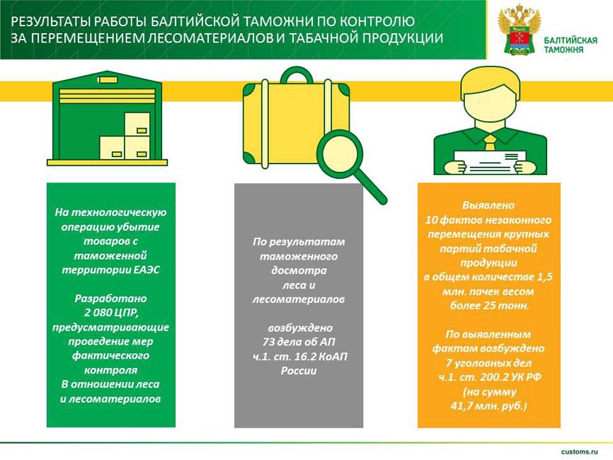 Возбуждено 1867 дел об административных правонарушениях. Обнаруженные и изъятые товары: табак и табачные изделия, оборудование и механизмы, товары, к которым применяются запреты и (или) ограничения на ввоз в РФ или вывоз, лесоматериалы, контрафактные товары, товары народного потребления.