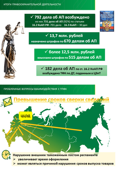 Заместитель начальника Центральной оперативной таможни Валерий Ногаев подвел итоги правоохранительной деятельности: «по итогам 9 месяцев 2021 г. ЦЭлТ возбуждено 792 дела об административном правонарушении (далее - дело об АП), 90 % из которых по статьям 16.2, 16.3 КоАП РФ. По окончании административного производства рассмотрено с назначением наказания в виде административного штрафа 650 дел об АП на сумму более 13,6 млн рублей. Взыскано штрафных санкций на сумму более 12,5 млн рублей.»
