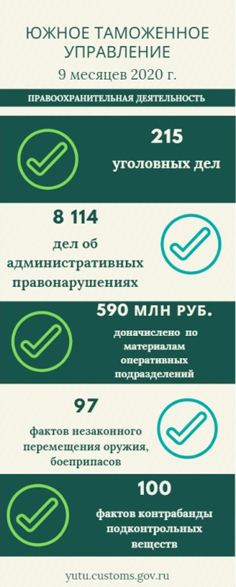 По итогам работы правоохранительных подразделений таможен Южного региона за 9 месяцев 2020 года прослеживается устойчивая положительная динамика выявления преступлений в области таможенного дела – возбуждено 215 уголовных дел, что на 40,5 % больше, чем в аналогичном периоде прошлого года. По преступлениям, ответственность за которые предусмотрена статьей 194 УК РФ (уклонение от уплаты таможенных платежей), возбуждено 36 уголовных дел, то есть 16,7 % от общего количества уголовных дел. Важным индикатором, характеризующим положительные результаты работы, является почти 50-ти процентное увеличение количества дел, возбужденных в отношении конкретных лиц, со 111 до 170. По материалам оперативных подразделений таможен ЮТУ доначислено платежей на сумму более 590 млн рублей.