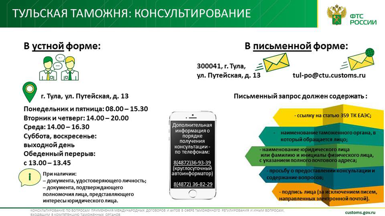 Напоминаем, что правовой отдел Татарстанской таможни ведет консультирование по таможенным вопросам всех заинтересованных лиц. Консультации проходят в ежедневном режиме и на бесплатной основе. Время консультирования можно уточнить по автоинформатору: (843) 291 92 00.