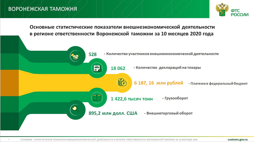 За 9 месяцев 2020 года таможенными органами региона выявлено 69 фактов перемещения наличной иностранной и российской валюты с нарушением таможенных правил, 10 фактов незаконного перемещения ювелирных изделий из золота и серебра. Возбуждено 71 дело об АП и 7 уголовных дел. Предметами правонарушений в частности стали 1,3 млн долларов США, 167,7 тыс. евро, 20,5 млн рублей, 1,38 кг изделий из золота, 5,4 кг изделий из серебра.