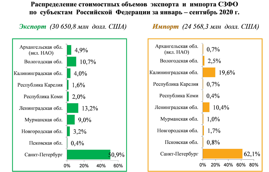 В октябре 2020 года таможенными органами Северо-Западного таможенного управления осуществлено взимание в федеральный бюджет Российской Федерации таможенных и иных платежей на сумму 61 млрд рублей, в том числе в отношении импортируемых товаров – 60,02 млрд рублей, экспортируемых товаров – 0,33 млрд рублей.