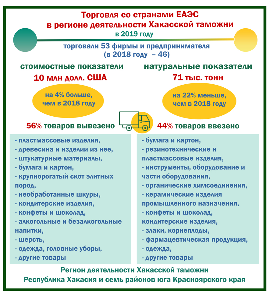 На основе сведений, содержащихся в статформах, ведется статистика взаимной торговли в рамках Евразийского экономического союза (ЕАЭС), в том числе в регионе деятельности Хакасской таможни. Так, в 2019 году взаимную торговлю со странами, входящими в ЕАЭС, осуществляли 53 фирмы и предпринимателя, поставленных на учет в налоговых органах Республики Хакасия и юга Красноярского края, в 2018 году – 46. Стоимостные показатели товарооборота в 2019 году увеличились на 4% и составили более 10 млн долларов США, натуральные показатели снизились на 22% и составили более 71 тыс. тонн. При этом на 78% увеличились стоимостные показатели и более чем в 3 раза натуральные по товарам, которые были ввезены в регион деятельности Хакасской таможни. Наиболее активно осуществлялась торговля с Казахстаном.