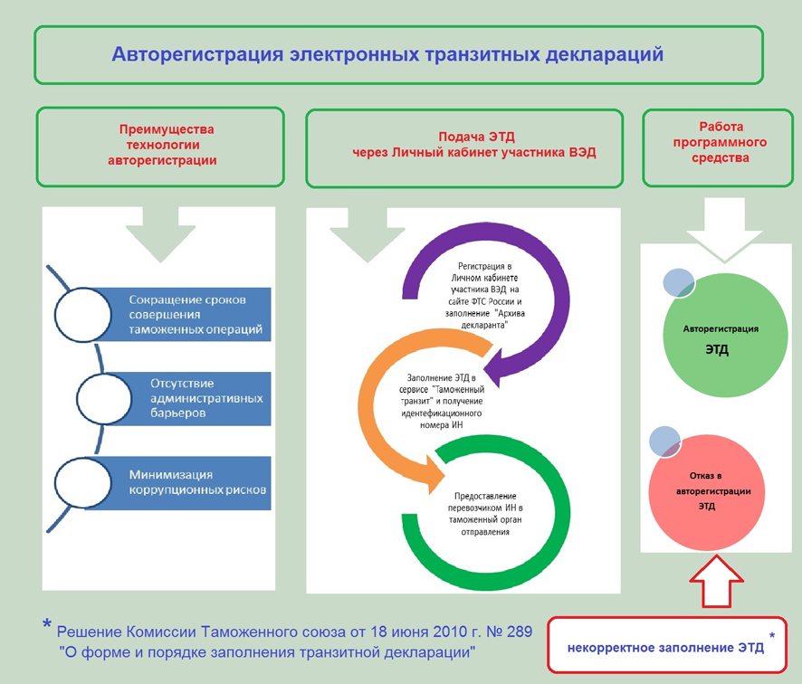 Одно из важных условий успешной авторегистрации – заполнение граф ЭТД в соответствии с требованиями Решения Комиссии Таможенного союза от 18 июня 2010 г. № 289 «О форме и порядке заполнения транзитной декларации». При оформлении декларантом ЭТД важно соблюдать данное условие, поскольку проверка на предмет корректности заполнения граф и отсутствия оснований для отказа в регистрации ЭТД проводится в автоматическом режиме.