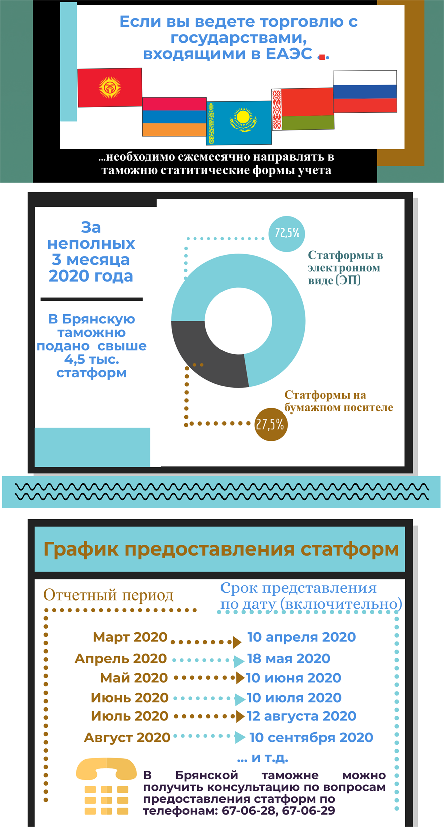 Таможня напоминает организациям и предпринимателям Ярославской и Костромской областей, ведущим или планирующим взаимную торговлю со странами-участниками ЕврАзЭС Казахстаном, Белоруссией, Арменией и Киргизией, о необходимости предоставления в таможенные органы статистических форм учета перемещения товаров. Обязанность лиц представлять статформы закреплена статьёй 278 Федерального закона от 03.08.2018 № 289-ФЗ «О таможенном регулировании в Российской Федерации и о внесении изменений в отдельные законодательные акты Российской Федерации», правила их заполнения и сроки представления определены постановлением Правительства России от 07.12.2015 № 1329 «Об организации ведения статистики взаимной торговли Российской Федерации с государствами - членами Евразийского экономического союза» (далее – Постановление Правительства).