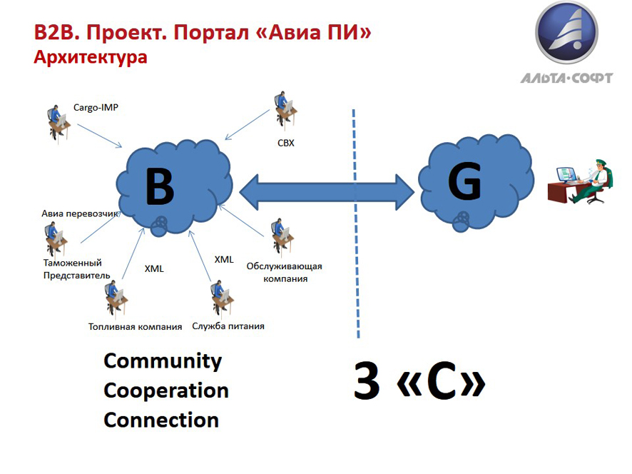 Возможно, это не перспективная схема. Тем не менее, такая примерная схема B2G существует сейчас. На ближайшее время есть три слова, которые я старательно подбирал на одну букву. Эти три слова можно отнести как к части В, так и к части G: Community (общество), Cooperation (сотрудничество), Connection (взаимосвязанность). За этими тремя буквами я вижу перспективу трех-пяти лет.