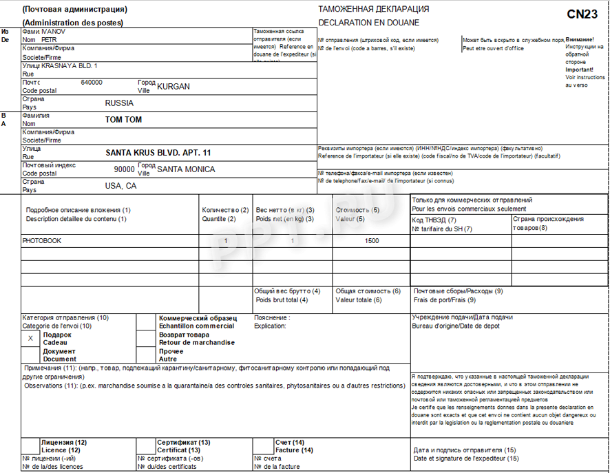 Для более быстрой пересылки форму заполняйте на английском языке. На оборотной стороне бланка есть подробная инструкция по его заполнению.