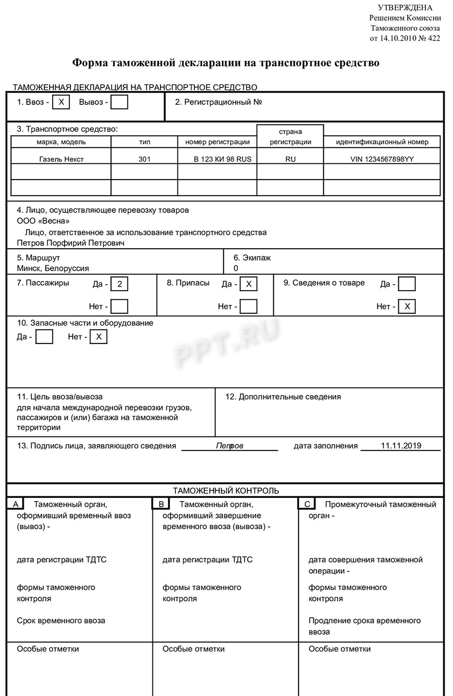 Наличие документа предусмотрено статьей 105 Таможенного кодекса Евразийского экономического союза. Это один из четырех видов деклараций, применяемых в сфере международных перевозок. Заполнять ее следует как при ввозе авто на территорию Союза, так и при его вывозе (статья 278 ТК ЕАЭС).