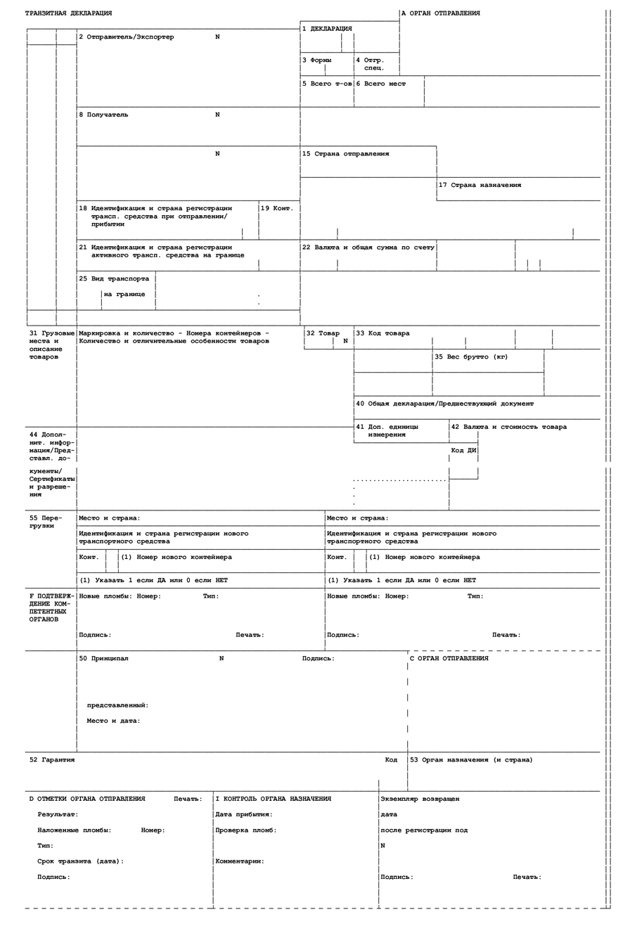 Стандартная форма отчетности предусмотрена к заполнению при перемещении товаров под таможенную процедуру транзита. Простыми словами, когда товары, перемещаемые через государственные границы, не подпадают под нормы таможенного регулирования. Для транзитной продукции не предусмотрено обложение пошлинами и налогами.