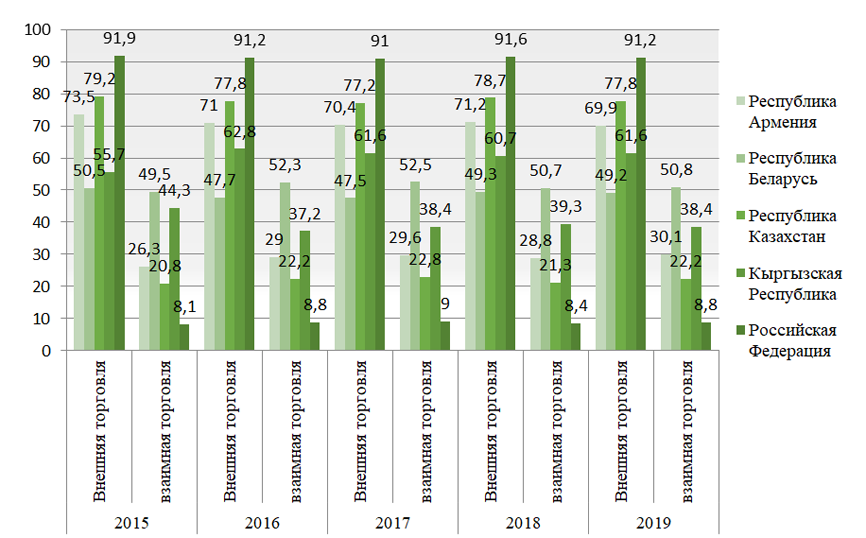 Рис. 1 – Внешняя и взаимная торговля государств-членов ЕАЭС в совокупном объеме внешнеторгового оборота стран,%. Составлено на основе данных [1], [2].